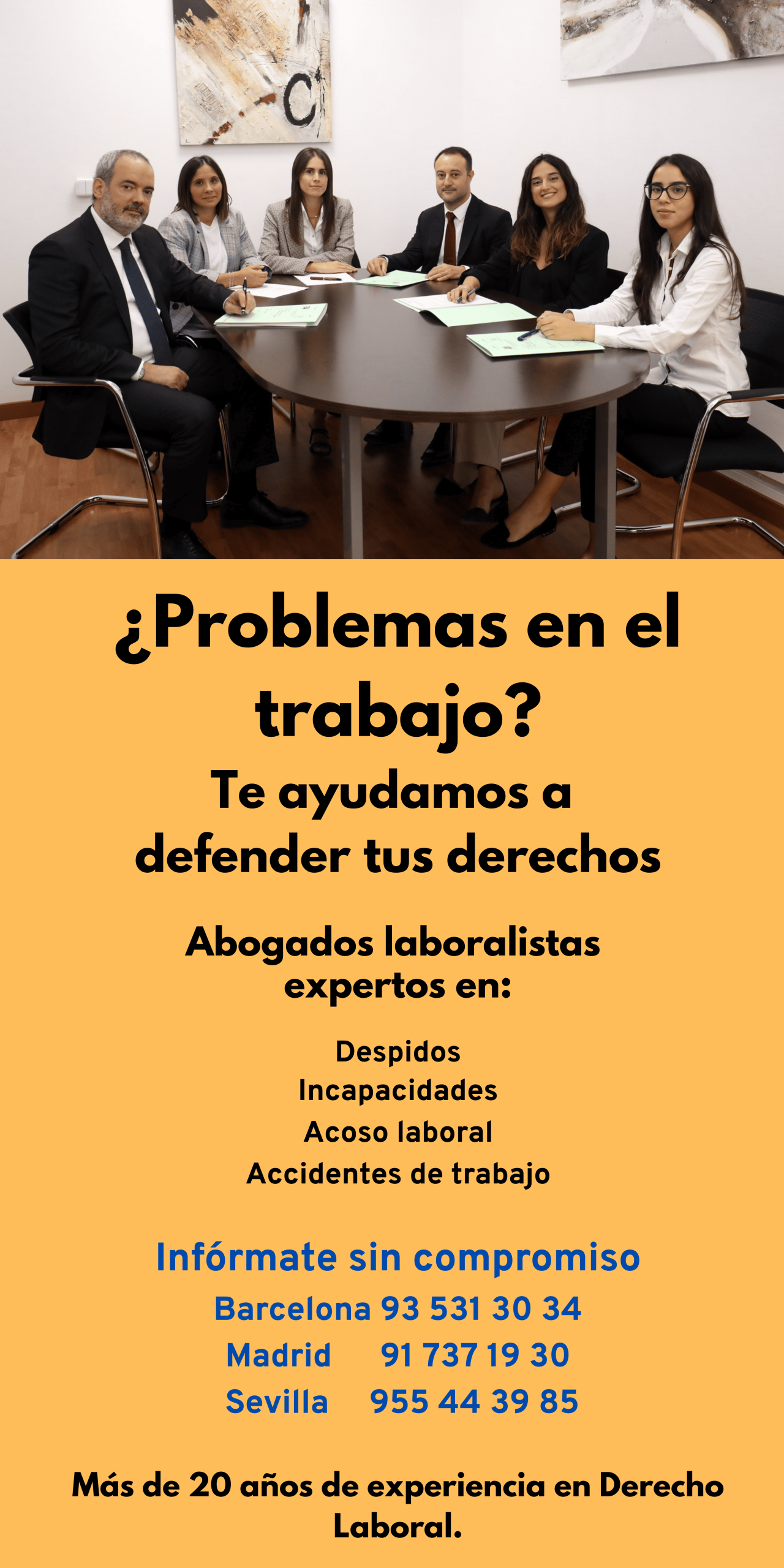 Si necesita asesoramiento legal o jurídico sobre algún tema relacionado con Derecho Laboral y de Seguridad Social, puede consultar con alguno de nuestros abogados laborales. lámenos al 629 683 746. Llevamos más de 20 años como despacho de abogados laboralistas en Barcelona asesorando a empresas y trabajadores para evitar conflictos y sanciones, o para defender sus derechos en caso de despido, incapacidad o acoso laboral. Llámenos al 629 683 746
